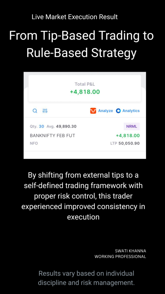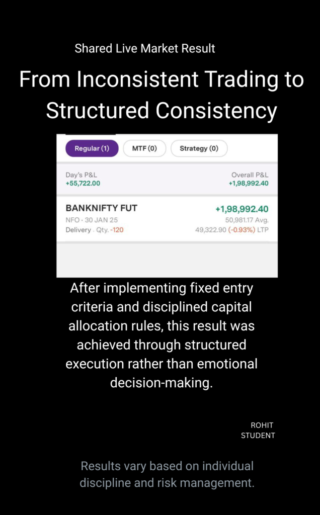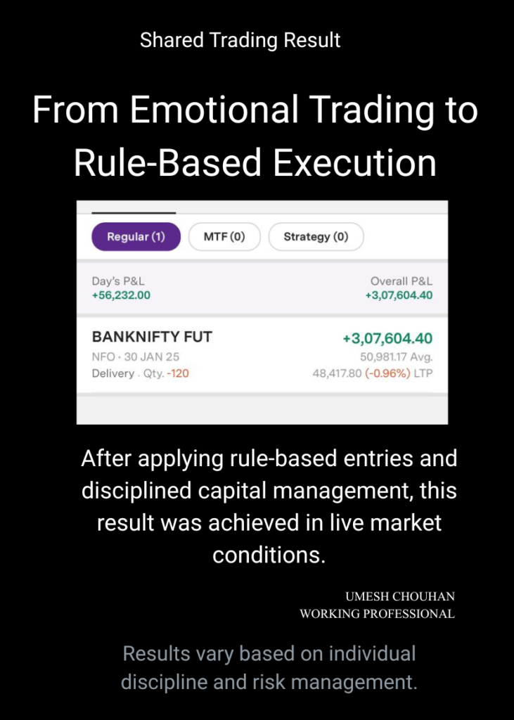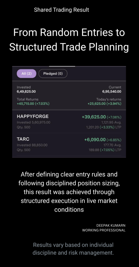 Through live market experience and mentoring working professionals, I’ve seen how clarity in entry rules, capital management, and disciplined execution transforms trading from emotional decisions into structured outcomes.
